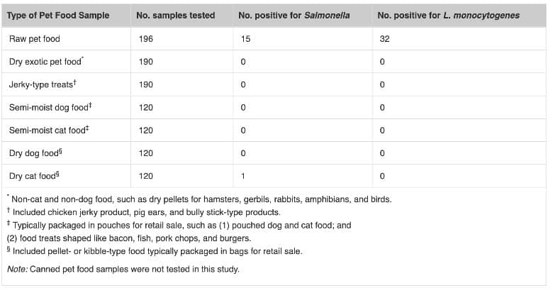 Raw food diets may increase the chance of being exposed to Salmonella, Listeria, and other bacteria that can cause foodborne illnesses. According to an FDA study, between 2010 and 2012, it screened over 1,000 samples of pet food, not including canned, to see what types are more likely to cause foodborne illness. According to their finding, it was raw food. (It should be noted there have been several recalls from dry- and wet-food manufacturers because of bacterial contamination.)