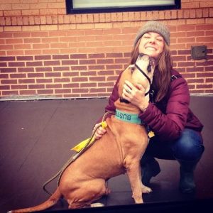 A woman crouching down next to a brown dog, showcasing the loving bond between human and pet.
