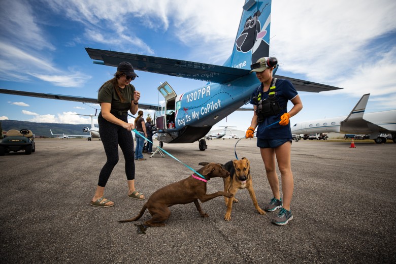Two women pilots standing next to a plane with dogs on leashes for an Animal Rescue flight.