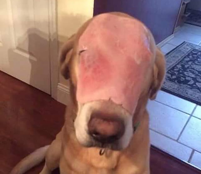 A dog with a swollen face caused by a ham that he accidentally ate, sitting on the floor.